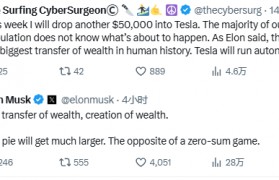 一位X用户发帖称:“本周我将再向特斯拉投入 5 万美元。我们大多数人并不知道即将发生什么。正如埃...
