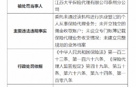 江苏大平保险代理有限公司泰州分公司被罚6.5万元:因未开立独立的佣金收取账户等四项主要违法违规事实