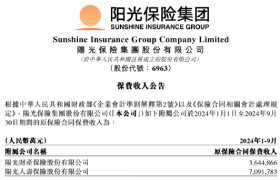 10月21日金融一线消息,阳光保险今日发布保费收入公告。公告显示,公司于2024年1月1日至20...