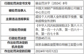 大地财险丽江中心支公司被罚45万元:虚挂个人代理人业务套取手续费、编制虚假业务资料