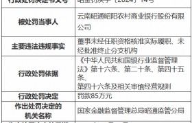 云南昭通昭阳农村商业银行被罚85万元:董事未经任职资格核准实际履职、未经批准终止分支机构