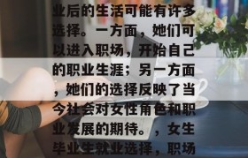 毕业之后的路,女生毕业后的生活可能有许多选择。一方面,她们可以进入职场,开始自己的职业生涯;另一方面,她们的选择反映了当今社会对女性角色和职业发展的期待。,女生毕业生就业选择,职场与期待并存