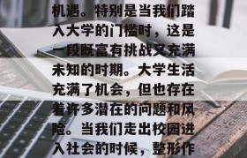 步入大学的门槛后,我们都知道了,这是一个重要的转折点。当踏入这个大家庭之后,我们会遇到许多新的挑战和机遇。特别是当我们踏入大学的门槛时,这是一段既富有挑战又充满未知的时期。大学生活充满了机会,但也存在着许多潜在的问题和风险。当我们走出校园进入社会的时候,整形作为一个普遍的话题,也逐渐引起了许多人的关注。,大学生面临新挑战与新机遇,如何面对校园与社会