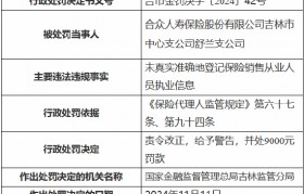 合众人寿吉林市中心支公司舒兰支公司被罚9000元:未真实准确地登记保险销售从业人员执业信息