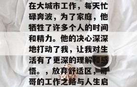 哥哥大学毕业后非要留在大城市工作,每天忙碌奔波,为了家庭,他牺牲了许多个人的时间和精力。他的决心深深地打动了我,让我对生活有了更深的理解和感悟。,放弃舒适区,哥哥的工作之路与人生启示