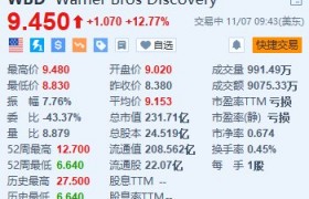 专题:聚焦美股2024年第三季度财报 华纳兄弟探索频道(WBD.US 涨超12.7%,报9.45美元...