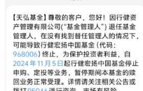 11月5日,投资者收到天弘基金服务短信通知,行健资产管理有限公司将不再担任基金管理人,导致行健宏...