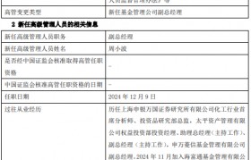 12月11日,海富通基金发布高级管理人员变更公告,新任周小波为副总经理,任职日期2024年12月...