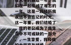 在大学的最后一年,我们在一起度过了难忘的一年。这是一段经历我永远不会忘记的时光。这一年里,我们结婚了,我的老公成为了我生命中不可或缺的一部分。,一生挚爱,我和我的大学室友结婚
