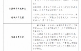 泰康人寿陕西延安中心支公司被罚合计15万元:因销售误导 承诺给予投保人合同约定以外的其他利益等