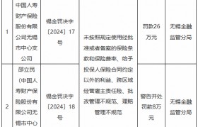 国寿财险无锡市中心支公司被罚26万元:未按照规定使用经批准或者备案的保险条款和保险费率等