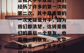 合租大学毕业后,我们经历了许多的第一次和第二次。其中最重要的一次无疑是分手,因为我们都清楚,这将是我们的最后一个朋友,也是唯一的朋友。,大学生分手,一个关于失去和新的开始的故事