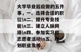 大学毕业后应做的五件事,一、选择合适的职位\n二、提升专业技能\n三、建立人脉网络\n四、参加实习和志愿者活动\n五、规划职业发展
