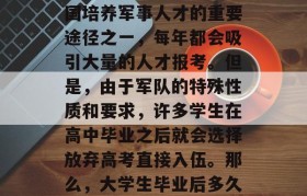 大学毕业后多久可以考军校?这是一个备受关注的问题。军校作为我国培养军事人才的重要途径之一,每年都会吸引大量的人才报考。但是,由于军队的特殊性质和要求,许多学生在高中毕业之后就会选择放弃高考直接入伍。那么,大学生毕业后多久可以考军校呢?,大学生应不应该先就业再考军校?
