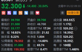 1月22日消息,港股新东方绩后低开近15%,现扩大至30.84%,报32.3港元,成交额超1亿港...