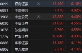 1月23日消息,港股中资券商股全线拉升,截止发稿,招商证券涨超6%,中国银河涨近5%,中金公司、...