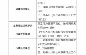 员工行为管理不到位、违规漏报案件风险事件报告!中国银行重庆云阳支行被罚45万元 一员工被禁业10年