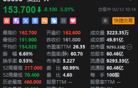2月12日消息,港股美团大跌逾5%,报153.7港元,成交额近50亿港元,总市值9293.33亿...