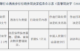 2月13日金融一线消息,中国人民银行山西省分行行政处罚决定信息公示表显示,山西五台农村商业银行股...