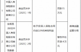 2月6日金融一线消息,曲靖金融监管分局行政处罚信息公示表显示,中国人寿保险股份有限公司曲靖分公司...