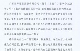 2月21日金融一线消息,广东南粤银行昨日发布《关于董事长辞任的公告》指出,该行董事会2025年2...