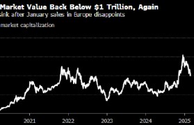 特斯拉市值周二跌破1万亿美元大关,此前有报道称该公司欧洲销售大幅下滑。 截至发稿,特斯拉股价...