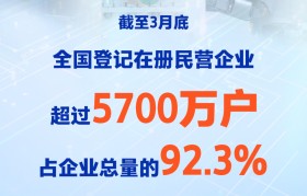 市场监管总局4月21日发布数据显示:截至3月底,全国登记在册民营企业超过5700万户,占企业总...