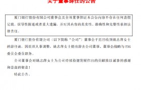 4月2日金融一线消息,厦门银行公告,公司董事会收到姚志萍女士的辞任函,因组织人事调整,姚志萍女士...