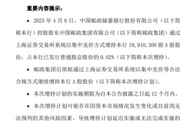 4月8日金融一线消息,邮储银行公告,控股股东邮政集团于2025年4月8日通过上海证券交易所系统以...