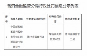 6月5日金融一线消息,据普洱金融监管分局行政处罚信息公示列表显示,中国邮政储蓄银行股份有限公司西...