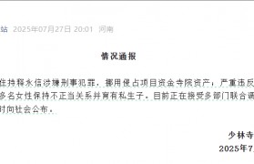 7月27日晚间,少林寺官方网站官微发布通报,少林寺住持释永信涉嫌刑事犯罪,挪用侵占项目资金寺院资产;...