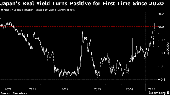 日本通胀挂钩债券遭抛售,促使其收益率四年来首次由负转正,反映出特朗普关税政策引发了更多的市场波动。