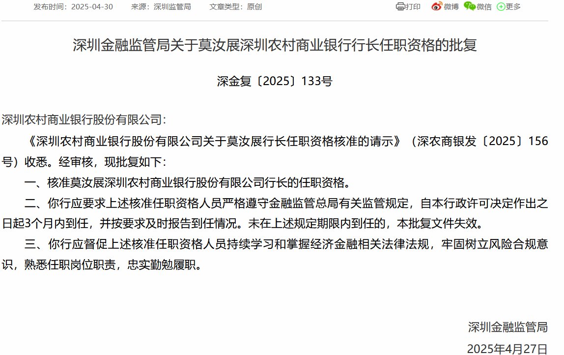 4月30日金融一线消息,深圳金融监管局今日发布关于莫汝展深圳农村商业银行行长任职资格的批复,核准莫汝展深圳农村商业银行股份有限公司行长的任职资格。