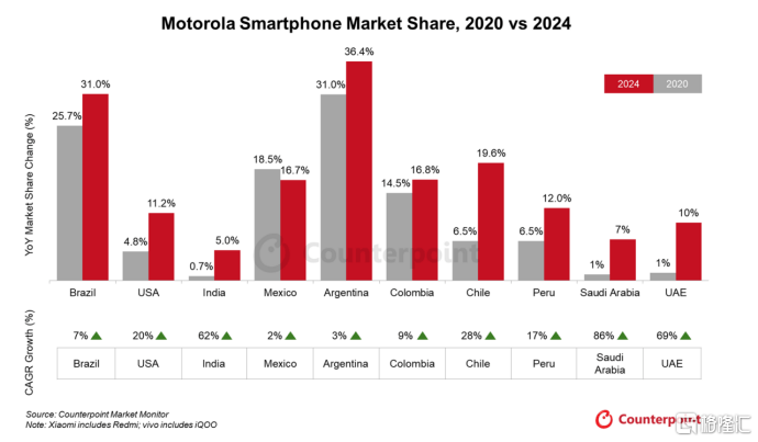 尽管2024年全球智能手机市场出货量仍低于2020年水平,但摩托罗拉表现亮眼,出货量比2020年高出75% ,年均复合增长率(CAGR)达15%。