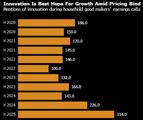 他们并非孤例。数据显示,今年迄今消费品行业领军企业在财报电话会议上提及创新的频率较去年同期增加了一倍多。