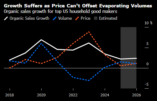 见效可能需要时间。高露洁棕榄、金佰利、Church & Dwight Co.、宝洁公司、高乐氏和Kenvue在最近的财报季中均下调了业绩指引,以考虑关税成本和消费趋势恶化的影响。