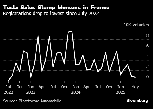 根据法国汽车行业协会Plateforme Automobile的数据,特斯拉5月在该国仅售出721辆汽车,较去年同期下降67%。尽管该公司推出了其最畅销车型Model Y的改款版本,但登记数量仍创2022年7月以来的最低水平。