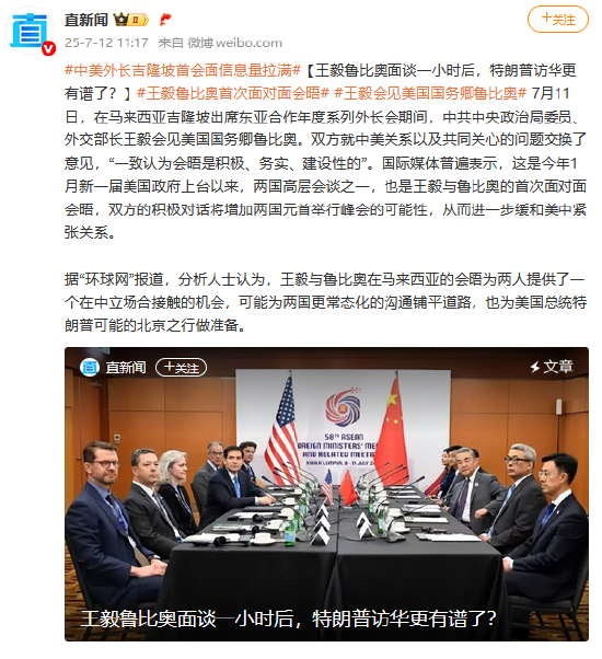 7月11日,在马来西亚吉隆坡出席东亚合作年度系列外长会期间,中共中央政治局委员、外交部长王毅会见美国国务卿鲁比奥。双方就中美关系以及共同关心的问题交换了意见,“一致认为会晤是积极、务实、建设性的”。国际媒体普遍表示,这是今年1月新一届美国政府上台以来,两国高层会谈之一,也是王毅与鲁比奥的首次面对面会晤,双方的积极对话将增加两国元首举行峰会的可能性,从而进一步缓和美中紧张关系。