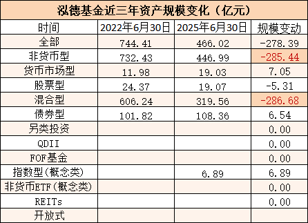 高管频繁变动的背后,是规模与业绩的双重压力。Wind数据显示,自2022年6月至2025年6月,泓德基金管理规模由744.41亿缩水至466.02亿元,非货资产规模由732.43亿降至446.99亿,行业排名由50跌至第78位。作为以主动权益投资为核心业务的基金公司,泓德旗下混合型基金占资产净值比例由81%降至69%。