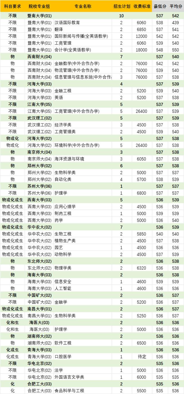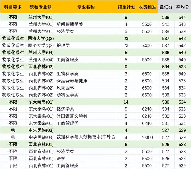 在530-540的分数段,211院校的选择开始增加,但985院校的选择仍然很少。下面是分数线同济Q3和西北农林02只有985所高校540分以下,值得考虑,其他几个专业组的推荐度还是比较低的: