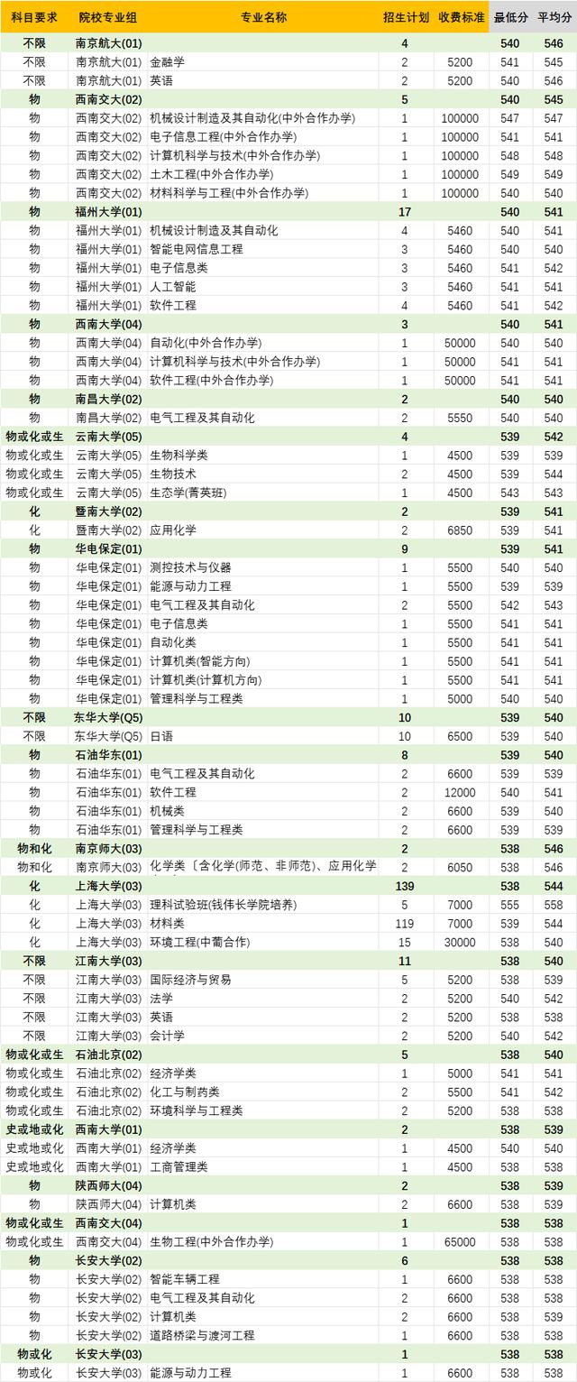 下面是211高校538-540分数段,福州大学01、西南大学04、南昌大学02、华电保定01、上大03、长安大学02都是推荐度较高的院校,但江浙沪也只有一个上大:
