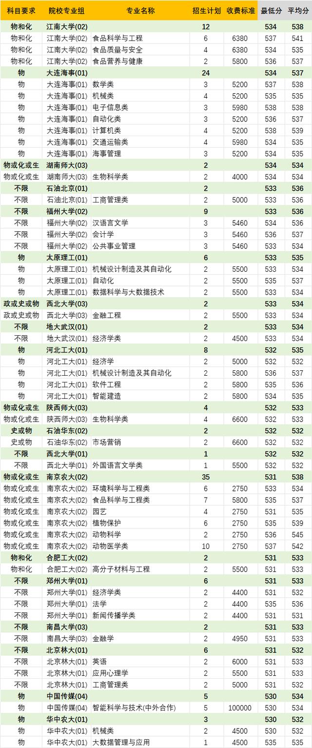 530-534分数段当中,首当其冲的是江南大学02由于选科要求较高,分数较低,性价比很高,但从2024年开始,理工科就是物化双选,江南大学食品专业的高概率将迎来一波分数上升的浪潮。此外,大连海事01、太原理工01、河北工大01、南京农大02、合肥工大这些都是推荐度比较高的: