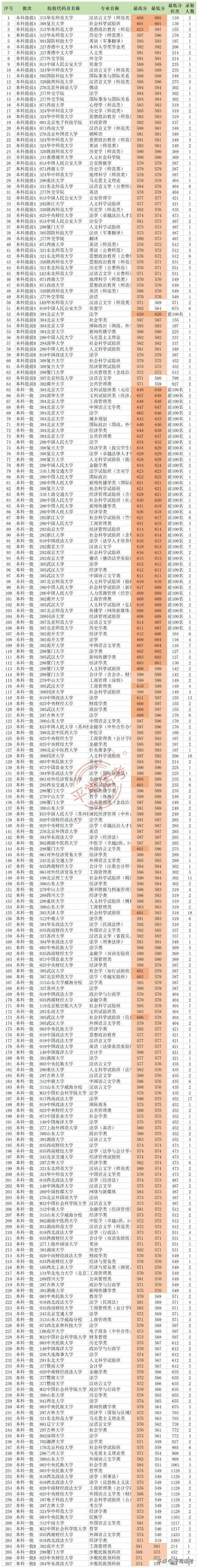 2、按录取最高分排名(600分以上):北京大学665分,清华657分,人大634分。复旦634分、上交629分、港大625分、华东师大623分、浙大621分,南京619分,中政法616分,武大615分、北师大614分、南开612分、同济608分、对外经贸大605分、厦大603分、天大601分、西交601分、吉大600分、央财600分;