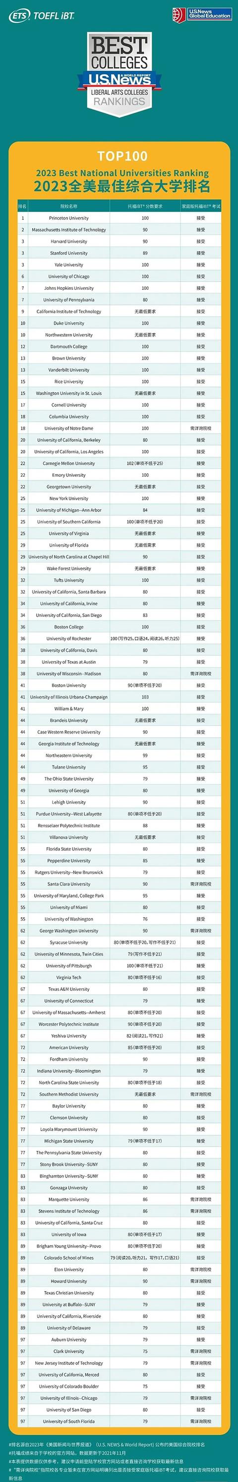 可以看出,TOP100所大学要求的托福成绩并不高。许多大学只能申请70分以上的低要求,有些大学甚至没有低要求。