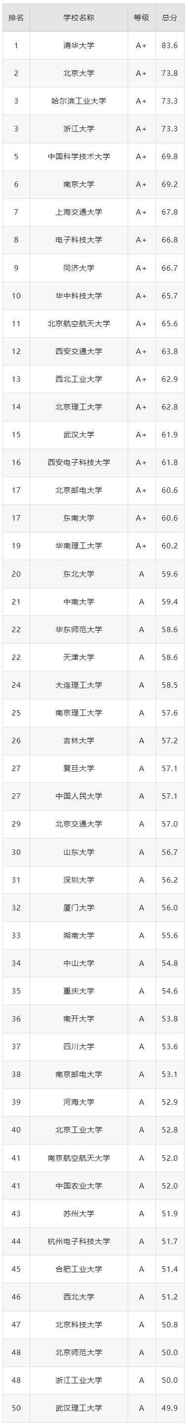 清华大学的计算机科学与技术专业以83.6分的高分排名第一。在计算机专业中,共有19所学校达到了A级 ,华南理工大学(总分60.2)、东南大学(总分60.6)、北京邮电大学(总分60.6)、西安电子科技大学(总分61.8)、武汉大学(总分61.9)、北京理工大学(总分62.8)等,这些学校的计算机专业总分超过60分,学科实力雄厚。