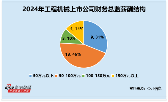 分行业来看,机械设备-工程机械行业(申万二级行业)上市公司财务总监CFO 2024年薪酬平均数约为92.61万元。其中薪酬最高为三一重工刘华,硕士学历,2024年薪酬高达450.86万元;薪酬最低为威博液压杨馨,大专学历,2024年薪酬为14.21万元(统计剔除了未完整领取2024年全年薪酬的财务总监CFO)。从整体薪酬分布来看,薪酬在50-100万元人数最多,共计13人,占比45%。