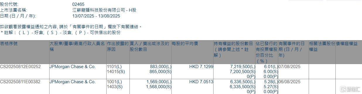 格隆汇8月13日丨根据联交所最新权益披露资料显示,2025年8月6日-8月7日,龙蟠科技(02465.HK)获JPMorgan Chase & Co.以每股均价7.0513-7.1299港元合计增持好仓245.2万股,涉资约1736万港元。