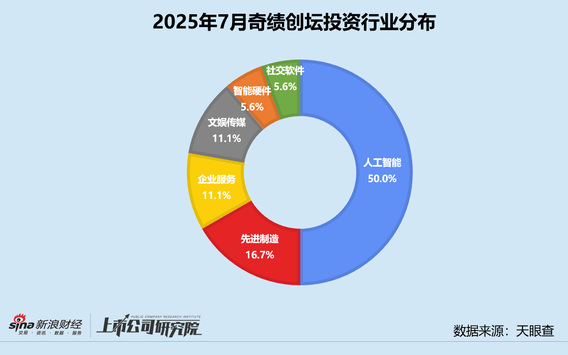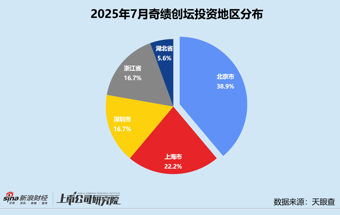 统计区间内,奇绩创坛公开披露的股权投资事件共18起,约为2024年7月的2.57倍,环比激增340%。往期数据显示,2024年下半年,奇绩创坛投资节奏整体平稳,平均每个季度出手参投少于20次。2025年,奇绩创坛由一季度的25起投资降至二季度的10起,直至7月才强势反弹。