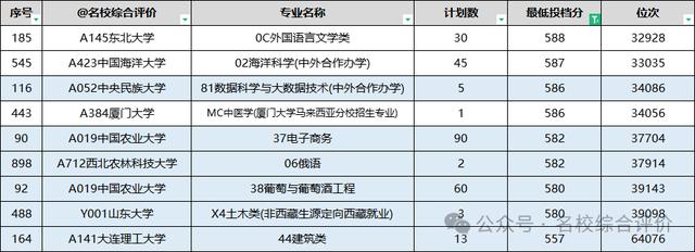 山东省大连理工大学557分,580分中国农业大学,西北农林科技大学582分,东北大学588分。