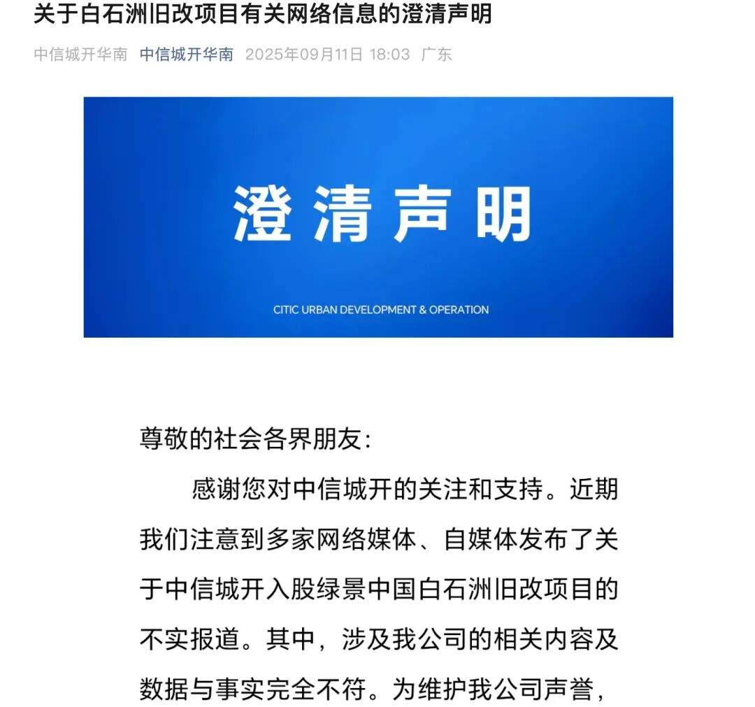 9月11日,“中信城开华南”微信公众号发布一则澄清声明,将深圳旧改“巨无霸”绿景白石洲项目再次推上风口。